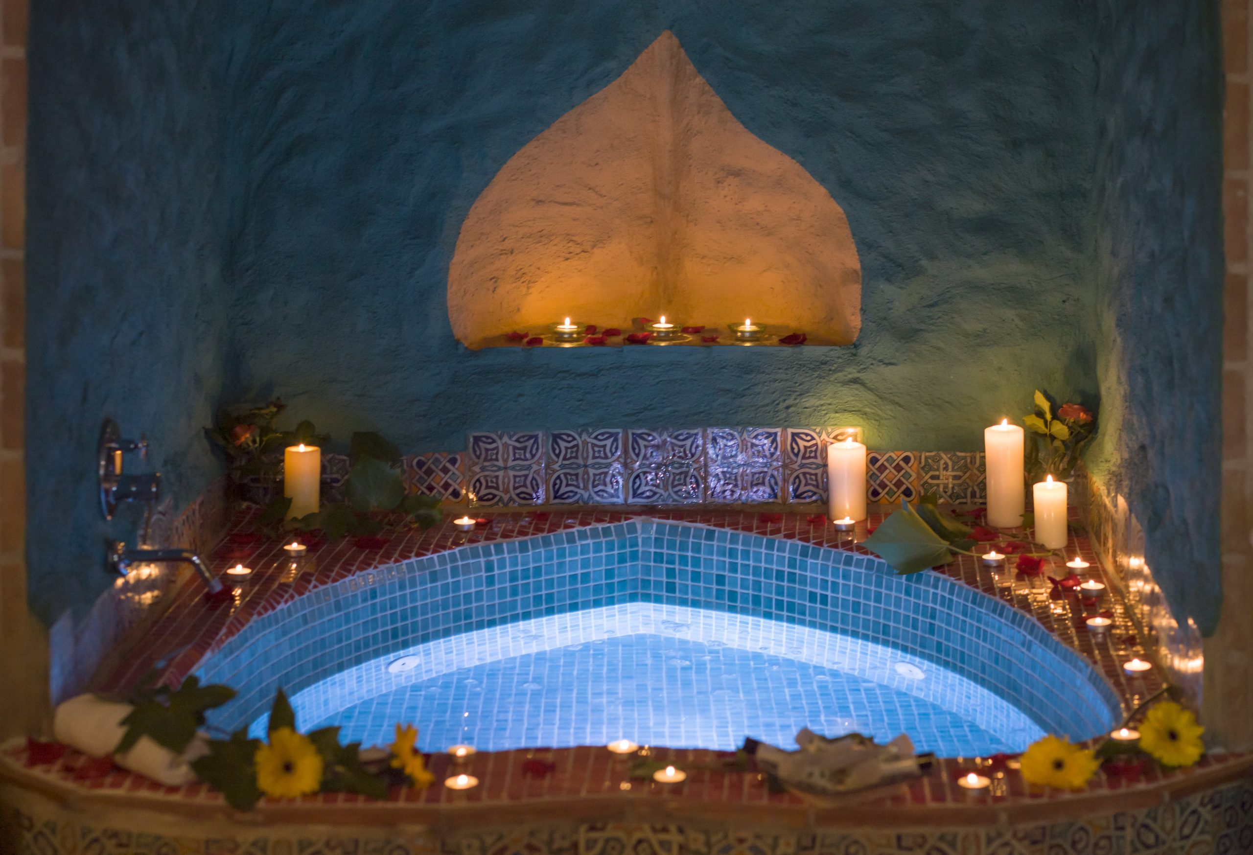 A) Bienvenida romántica ( pasillo de pétalos de rosa, champán, bombones, sales de baño y velas).
